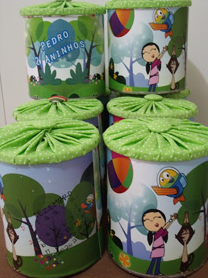 O tema: peixonauta, mas como não tem muita opção de lembrancinhas com esse tema, fiz as latinhas com faixa de peixes e fiz também um peixe com balões. Não ficou lá muito parecido com o peixonauta, mas ficou bonitinho, as crianças amaram, principalmente porque a latinha estava cheia de doces. Enfim, uma lembrancinha baratinha, fofa e muito útil.